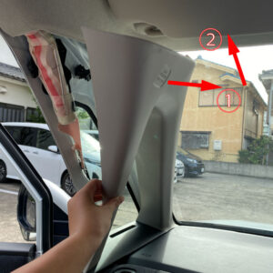 助手席側フロントピラーガーニッシュの上部を手前に引き出すと、アッパークリップ(1カ所)のロック解除されます。 中央部をさらに引き出してクリップ(3カ所)を外します。その後上の方向に引き上げて取外します。- アッパクリップは車両側に残ります。